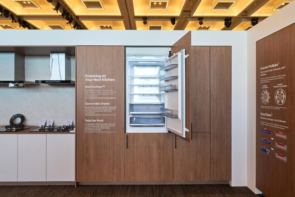 Masuk ke area dapur, LG menghadirkan solusi yang terasa lebih intuitif. Desain kulkas terbaru dengan konsep Fit & Max memungkinkan pemasangan yang lebih presisi berkat Zero Clearance Hinge, sehingga dapat menyatu dengan kabinet tanpa menyisakan ruang.