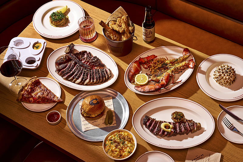 Steak: Coach menyajikan potongan daging USDA Prime dan Satsuma Wagyu A5 Jepang yang berkelas, dilengkapi dengan bawang putih panggang dan mentega berbentuk C khas merek ini. Porterhouse—steak ikonik dari New York City—menjadi sajian utama, terkenal dengan rasa yang bold dan ukurannya yang besar, cocok untuk dibagikan. Tamu juga bisa menikmati Dover Sole dengan mentega caper citrus, Lemon Thyme Roasted Chicken, dan Maine Lobster yang dipanggang di atas api terbuka.